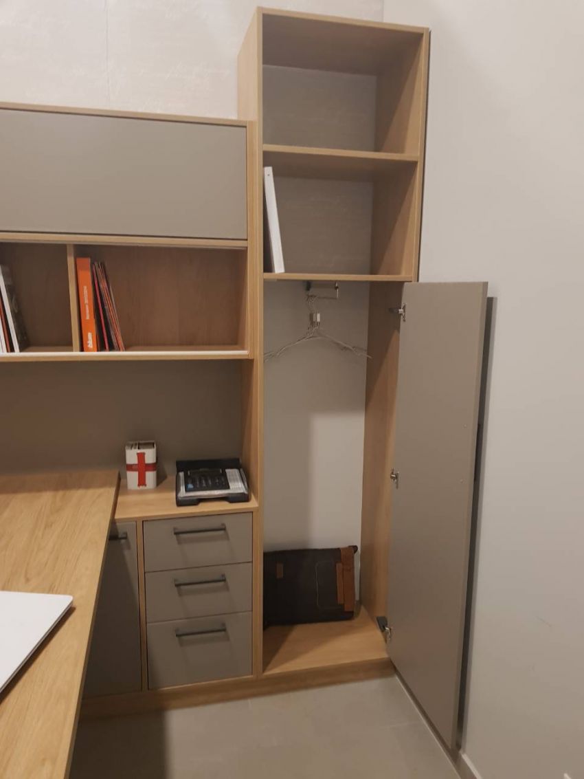 Pe lateral avem 2 dulapuri pentru haine, din motiv ca adincimea dulapului este 400 mm am pus in loc de bara clasica, un mecanism mobil.