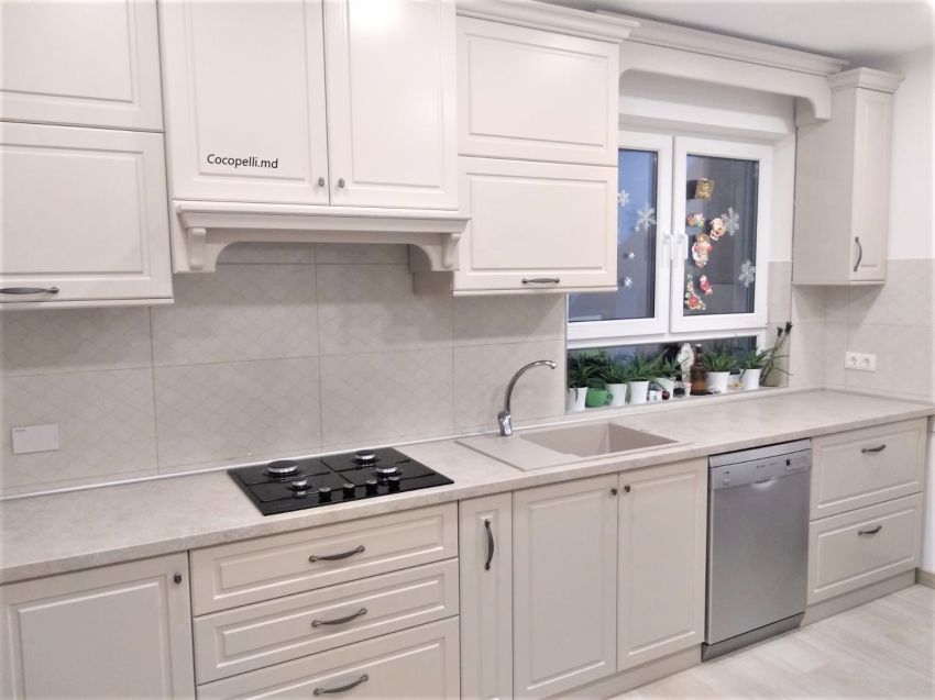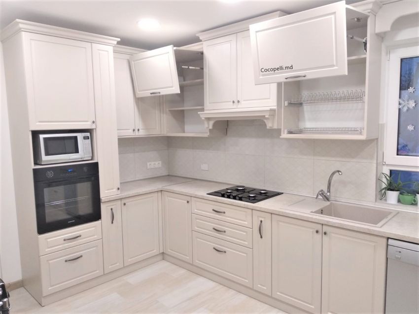 Bucataria are parametri generosi, partea de la geam are o lungime de 4 metri liniari iar pe stinga sint 2 , Pentru ca partea de sus are in cadrul ei un geam, am folosit un element decorativ care sa uneasca viziual partile si sa primim un ansamblu armonios.