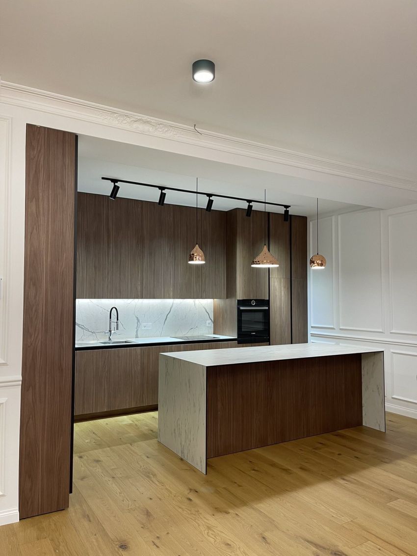 Această bucătărie se putea fabrica din furnir și blat din piatră dar sa optimizat bugetul, astfel am completat bucătaria cu mecanisme de top, iar pentru exterior am optat pentru pal frumos texturat si placa compact de 12 mm