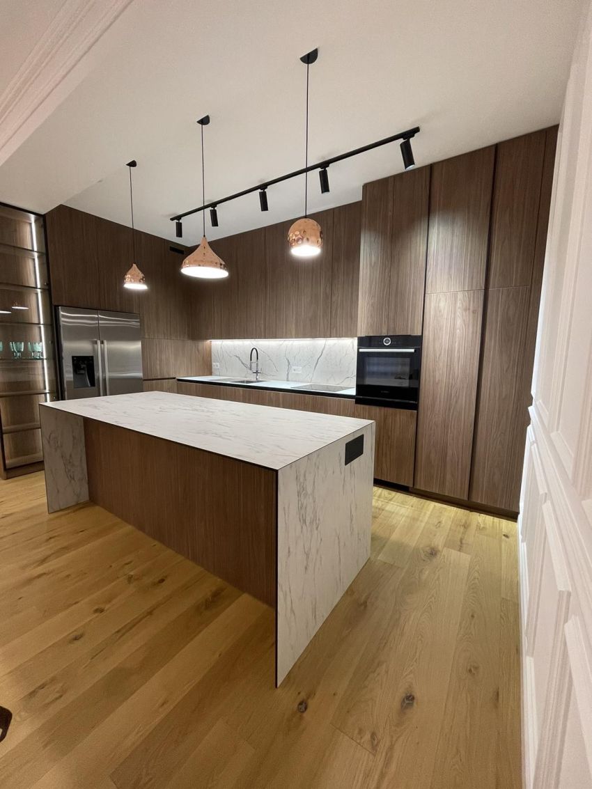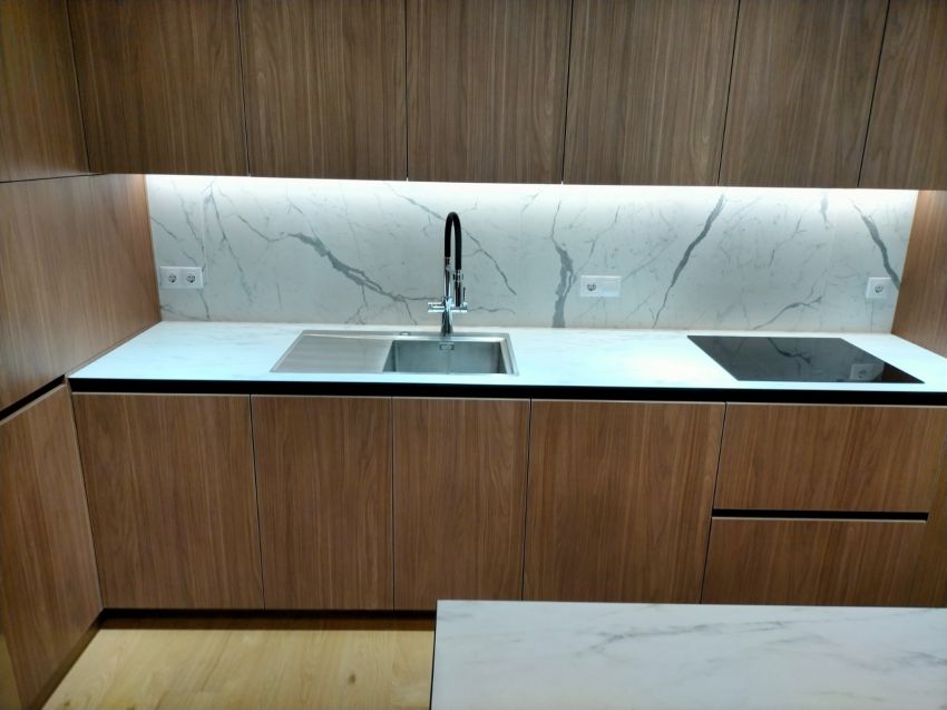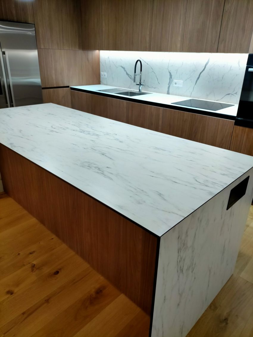 Bucătărie cu fronturi din pal și masă de lucru din plită compact